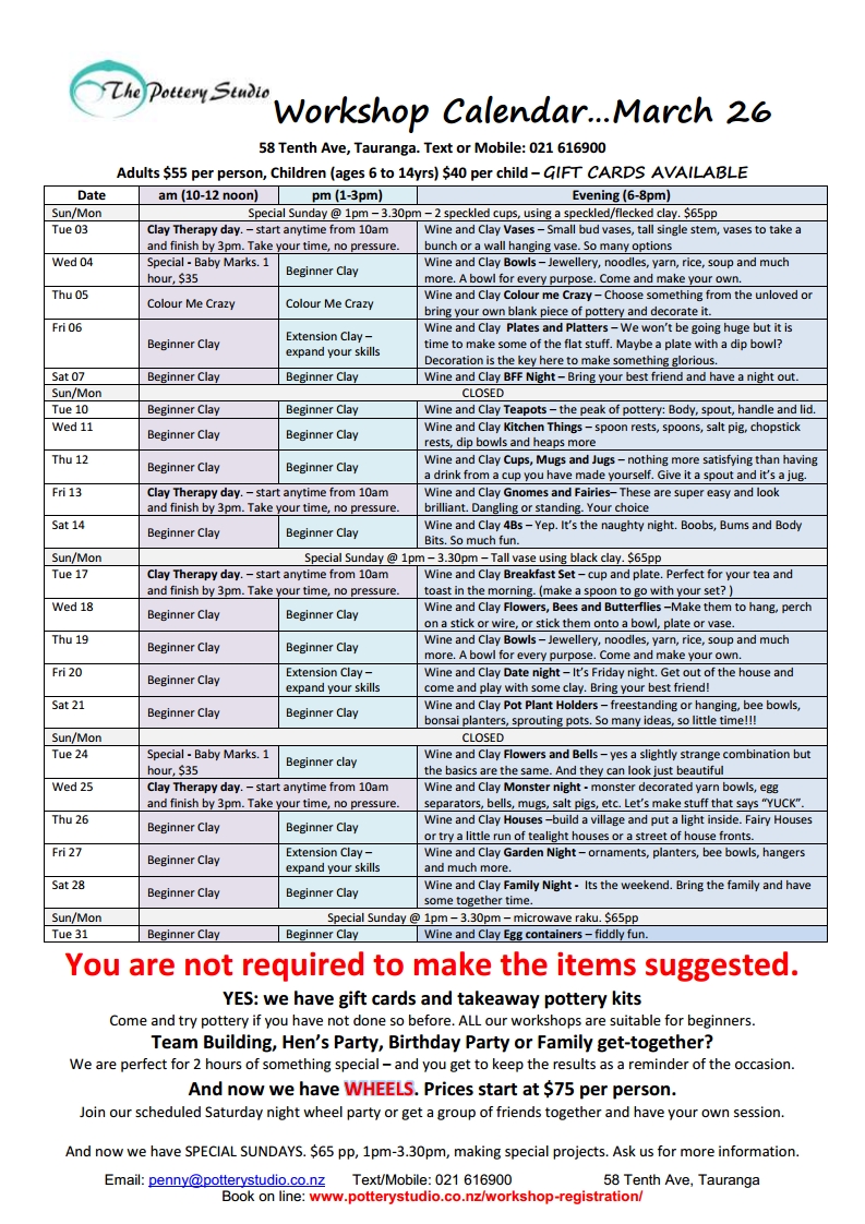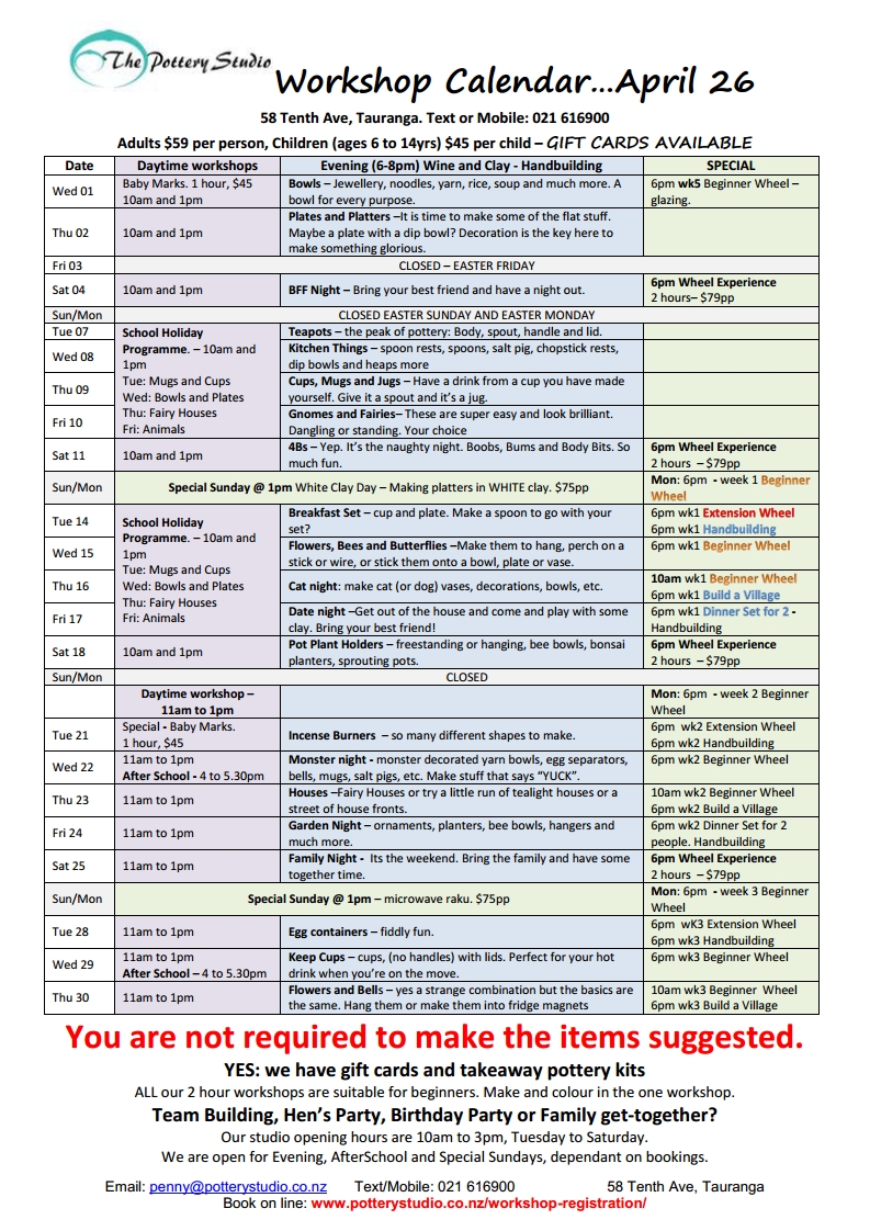 Prices include GST, (Courses are GST extra) the tutor, clay, paint, glazing, and firing with lots of fun. Private lessons, for individuals or group is on demand.